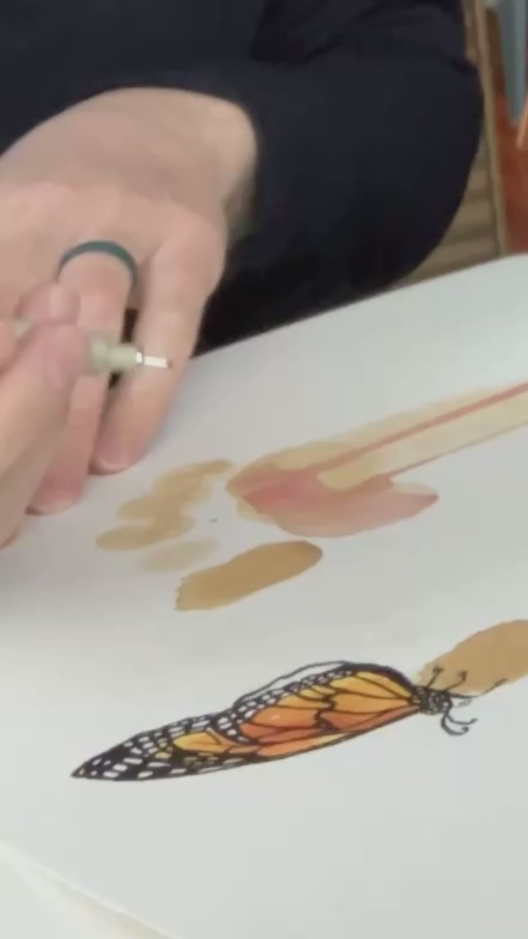 In this piece, the Monarch butterfly symbolizes today’s immigrants in their struggle for dignity and justice. The cut and sewn portion of the watercolor symbolizes the rift that occurred in my family when my ancestors left the ground of their ancestors and my efforts to reconnect through my own ancestor practices.